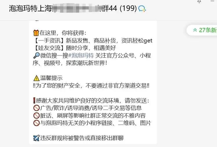 记者矜重到,为支吾这类情况,泡泡玛特也在上海本质单账户限购、预约制入场、加门店官方微信群线上购买、小轨范下单次日到店自提等方式等进行筛减,减少了现场列队抢购的错落词语,也防御有东谈主大批囤货。“莫得抢到的不错先加咱们门店社群,不外群里不允许黄牛发布告白信息,一朝发现会将其踢出群,不再允许加入。”伙计先容谈。